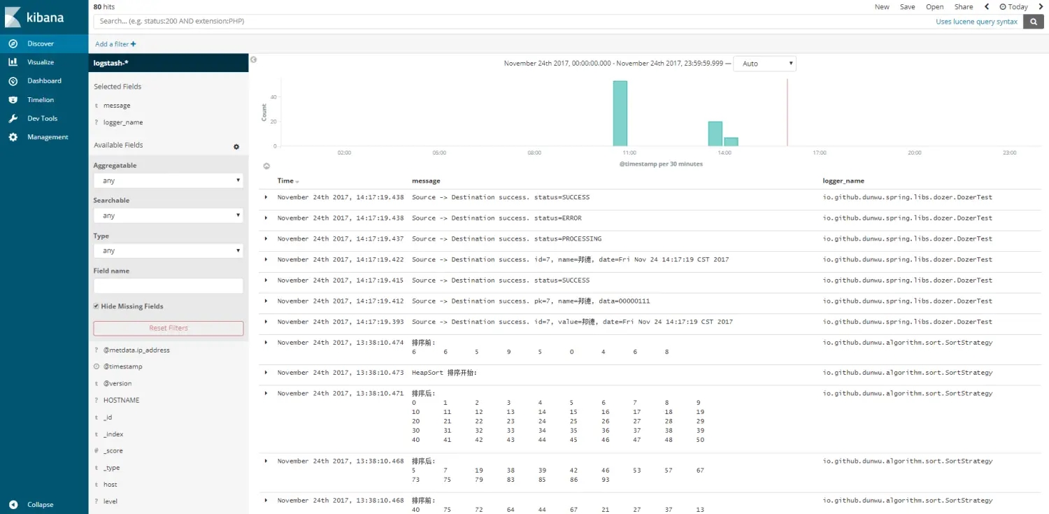大功告成,此后,io.github.dunwu.spring 包中的 TRACE 及以上级别的日志信息都会被定向输出到 logstash 服务。
